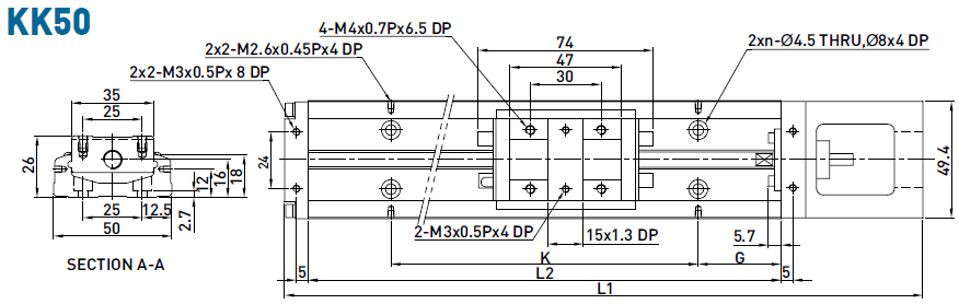 KK50導(dǎo)軌長(zhǎng)度 : 150, 200, 250, 300。
